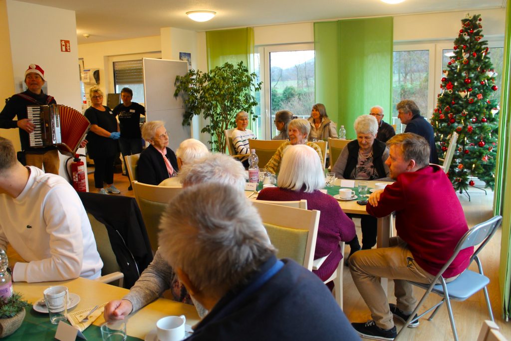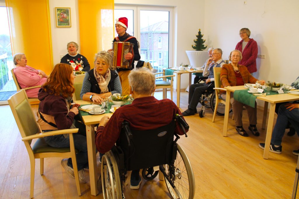 Unsere Weihnachtsfeier war ein voller Erfolg! In festlicher Atmosphäre und bei guter Stimmung wurde viel gelacht und gesungen. Geschichten wurden vorgelesen, Gedichte vorgetragen und Weihnachtslieder gemeinsam angestimmt. Ein besonderes Highlight war unser Musiker Herr Karasch mit seinem Akkordeon, der die Bewohner mit seinen Melodien verzauberte. Unsere Heimleitung hielt eine herzliche Rede, und bei Kaffee, Kuchen und Getränken genossen alle einen besinnlichen Nachmittag. Ein rundum wunderschöner Tag für alle!